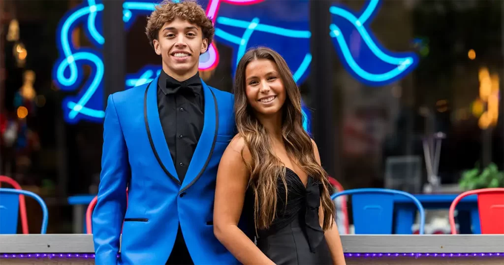 The traditional thing to do is to wait until your lady picks out her dress. Then you simply pick out a prom tux with a vest and tie with a color to match it. If she’s wearing a black dress, that’s even easier and leaves you with more options.